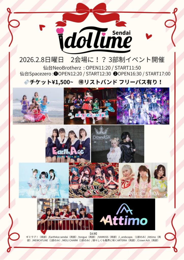 【出演】ギミラブ! / EarthAce-sendai / tongue / VAMKISS / Attimo / Crown Ash / 凛々しくも臨界に咲くARTERIA / MEWCATUNE(一部のみ) /MEILI CHARM(一部のみ) / i_andscape.(一部のみ)